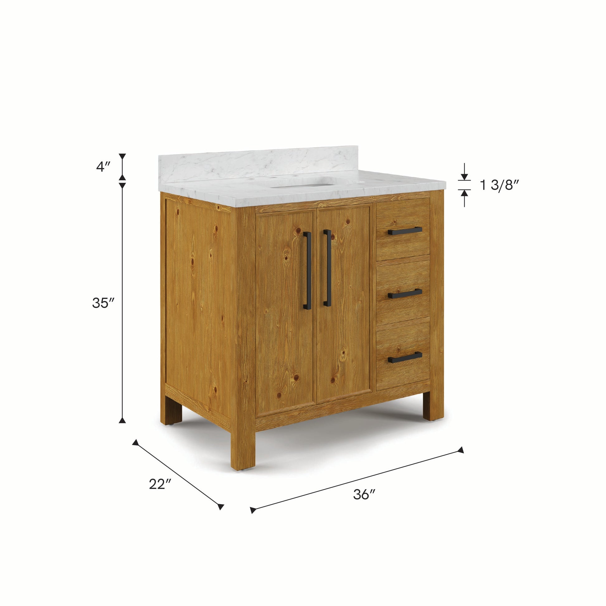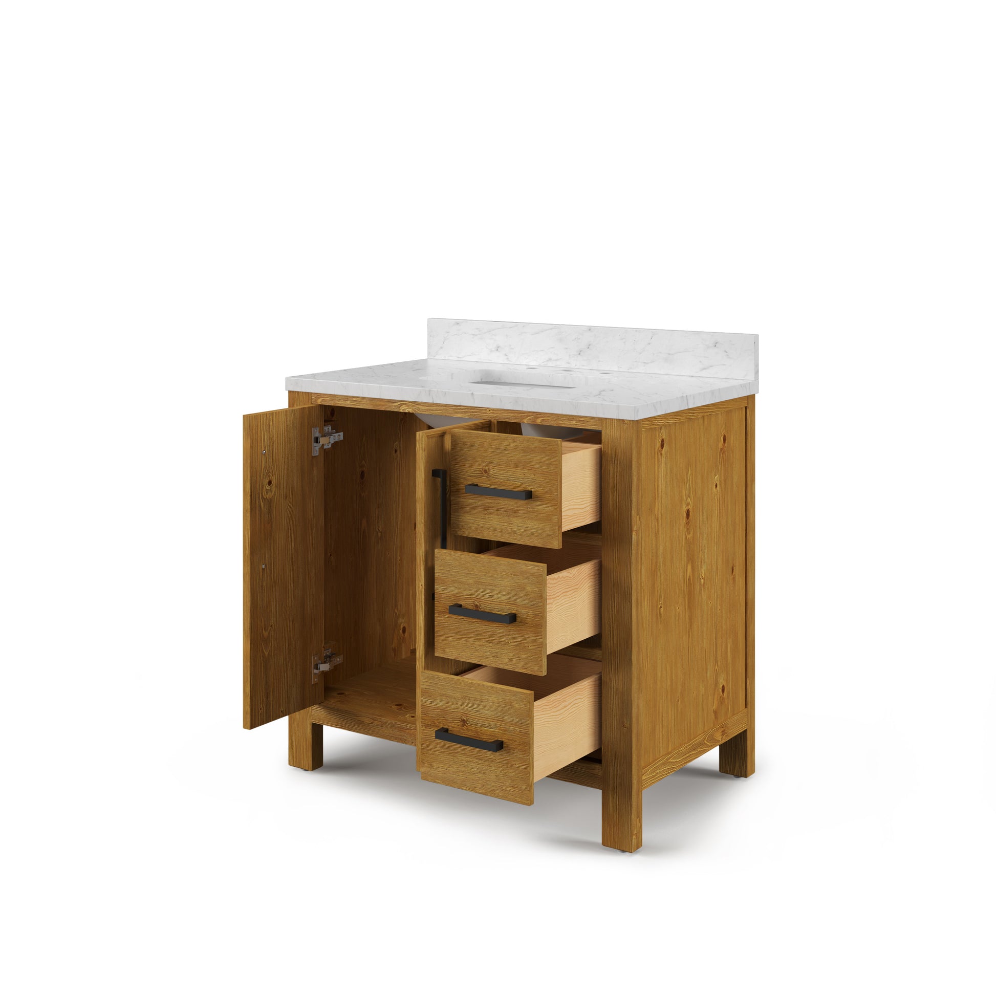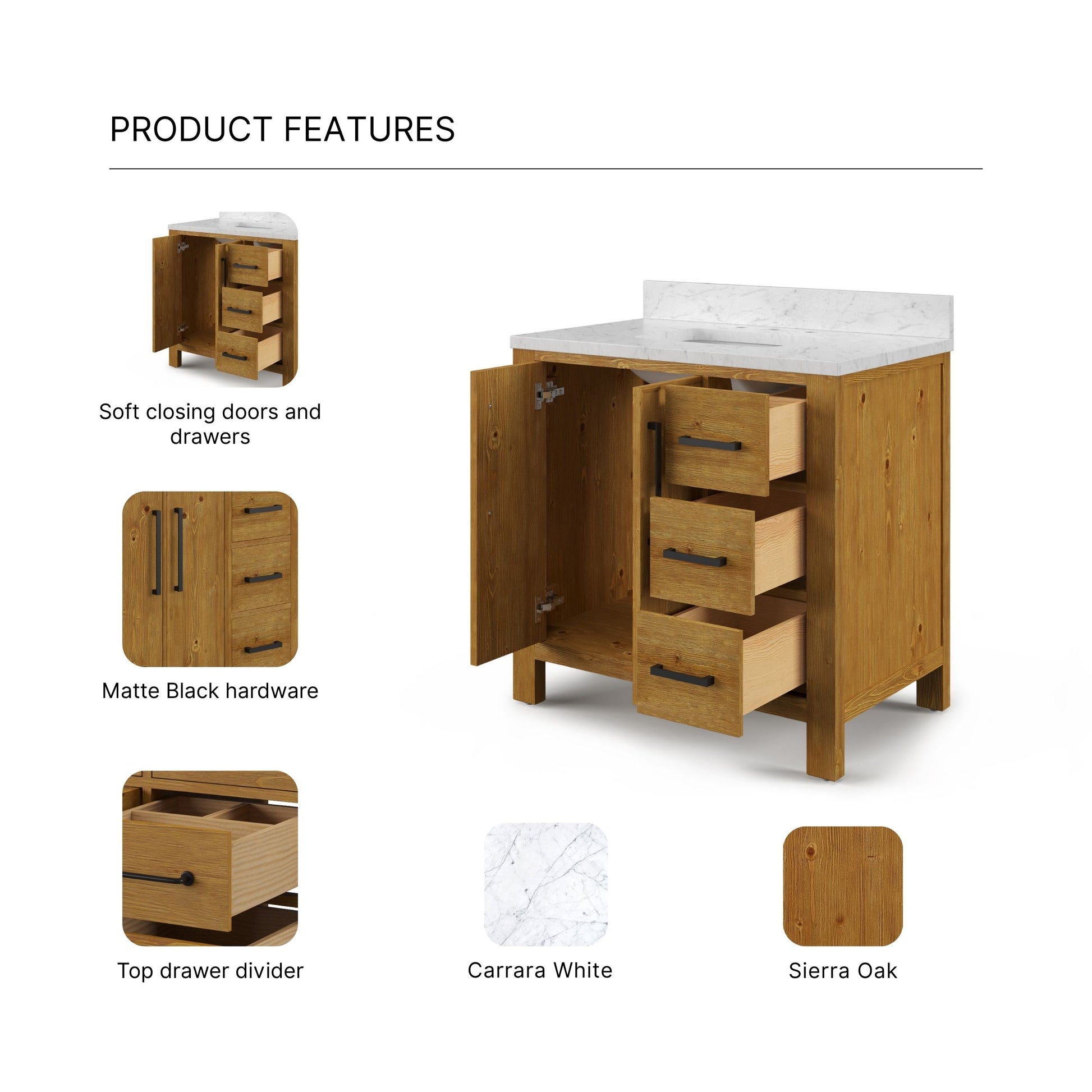 Bring Mid-Century Modern warmth to your bathroom with the 36" Dino Single Sink Bathroom Vanity in Sierra Oak. Made from high-quality wood, this freestanding vanity features a natural, light wood finish, Matte Black hardware, and a Carrara white engineered marble top with matching 4" backsplash. A white undermount ceramic sink and pre-drilled 8" widespread faucet holes make installation easy. Soft-close doors, three pull-out drawers, and adjustable shelves offer generous, customizable storage. Fully assembled and compact, it's ideal for standard bathrooms needing function and style.