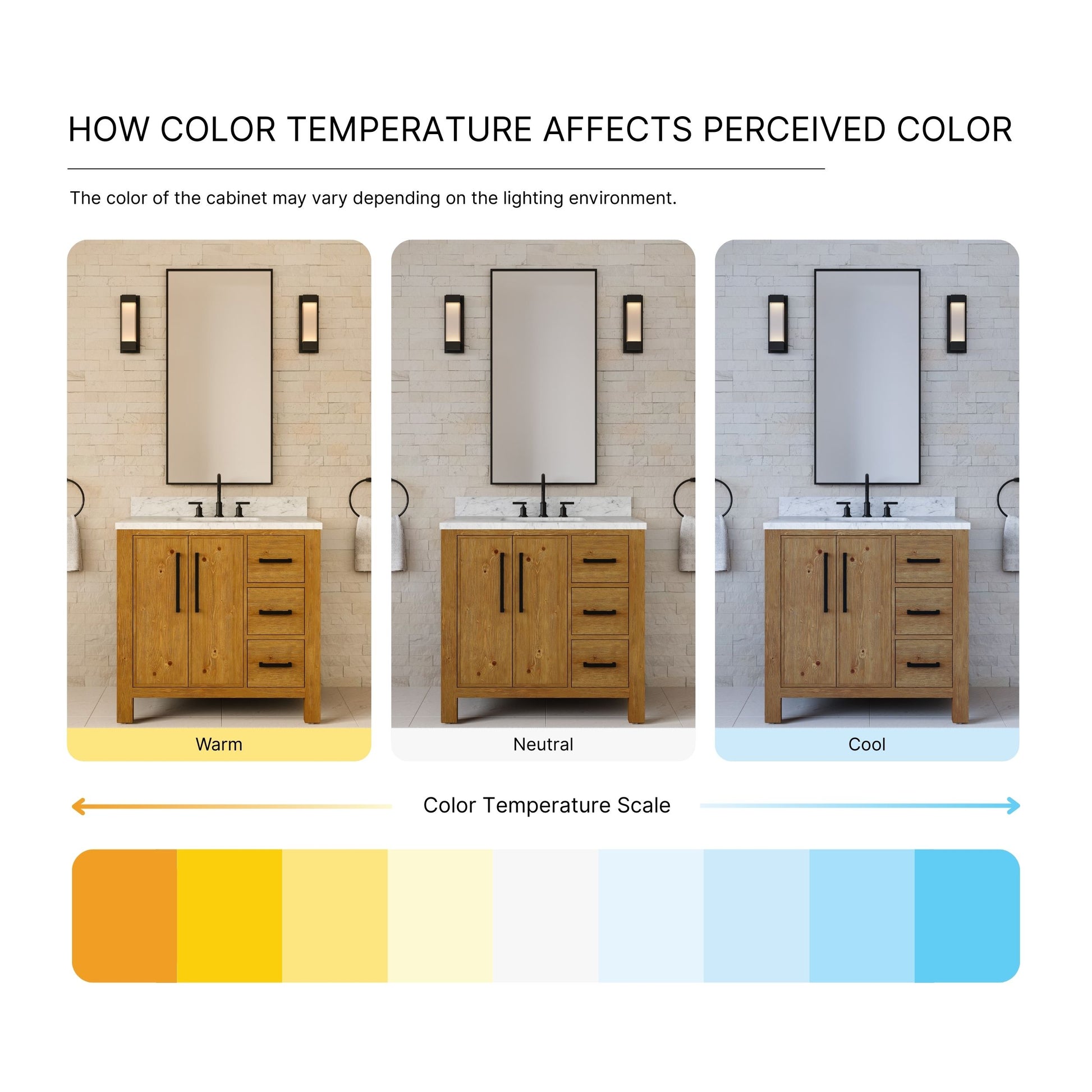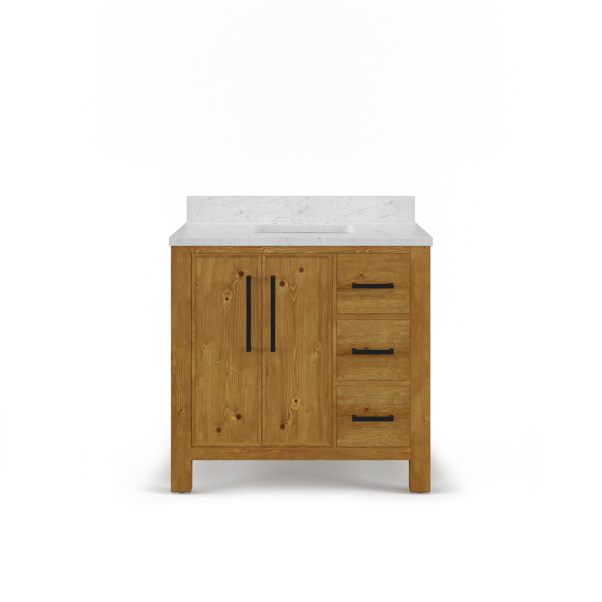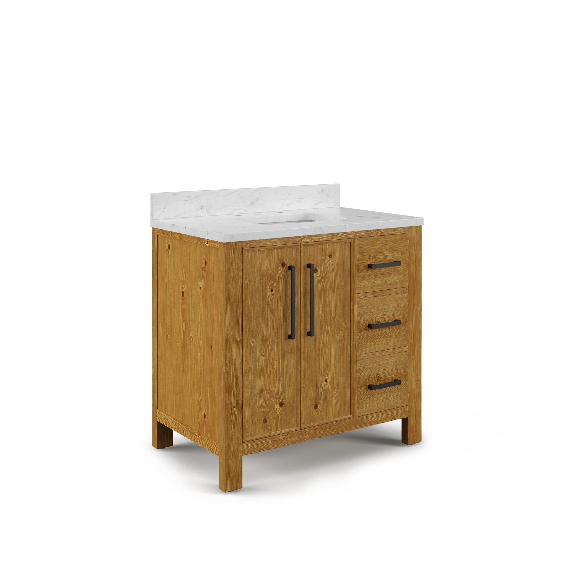Bring Mid-Century Modern warmth to your bathroom with the 36" Dino Single Sink Bathroom Vanity in Sierra Oak. Made from high-quality wood, this freestanding vanity features a natural, light wood finish, Matte Black hardware, and a Carrara white engineered marble top with matching 4" backsplash. A white undermount ceramic sink and pre-drilled 8" widespread faucet holes make installation easy. Soft-close doors, three pull-out drawers, and adjustable shelves offer generous, customizable storage. Fully assembled and compact, it's ideal for standard bathrooms needing function and style.