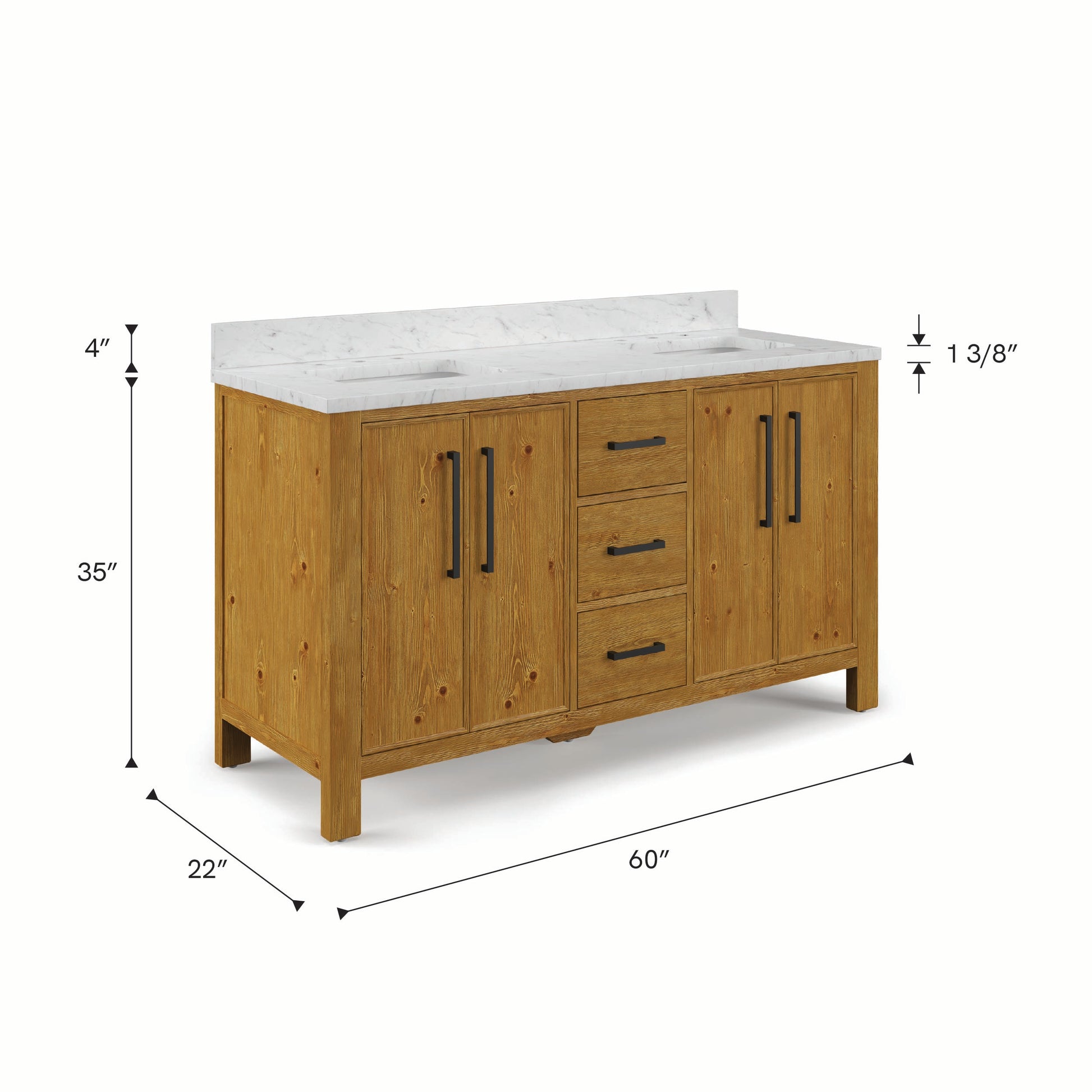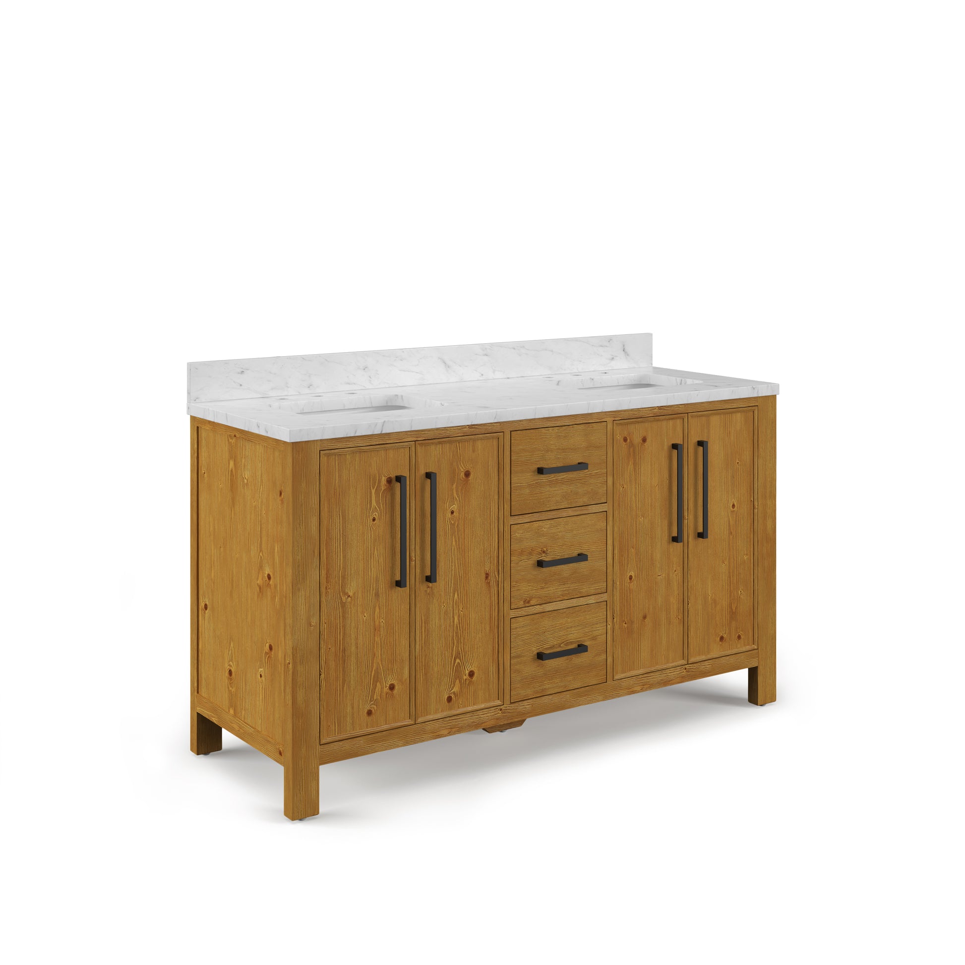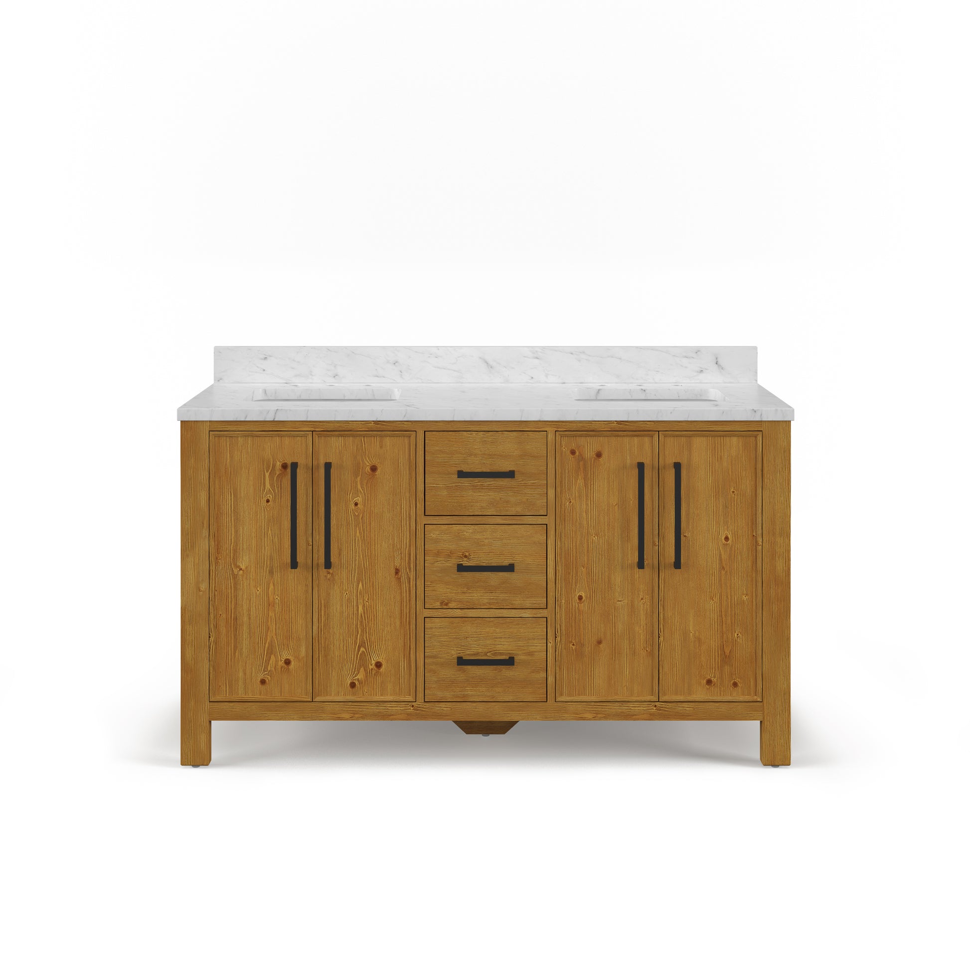 Bring Mid-Century Modern style to your bathroom with the 60" Dino Double Sink Bathroom Vanity in Sierra Oak. Made from high-quality wood, this freestanding vanity features a natural, light wood finish, Matte Black hardware, and a Carrara white engineered marble top with a matching 4" backsplash. Two white undermount ceramic sinks with built-in overflow and pre-drilled 8" widespread faucet holes make installation easy. Soft-close doors, three pull-out drawers, and adjustable shelving offer smart, spacious storage. Fully assembled, it’s perfect for large bathrooms and master baths.