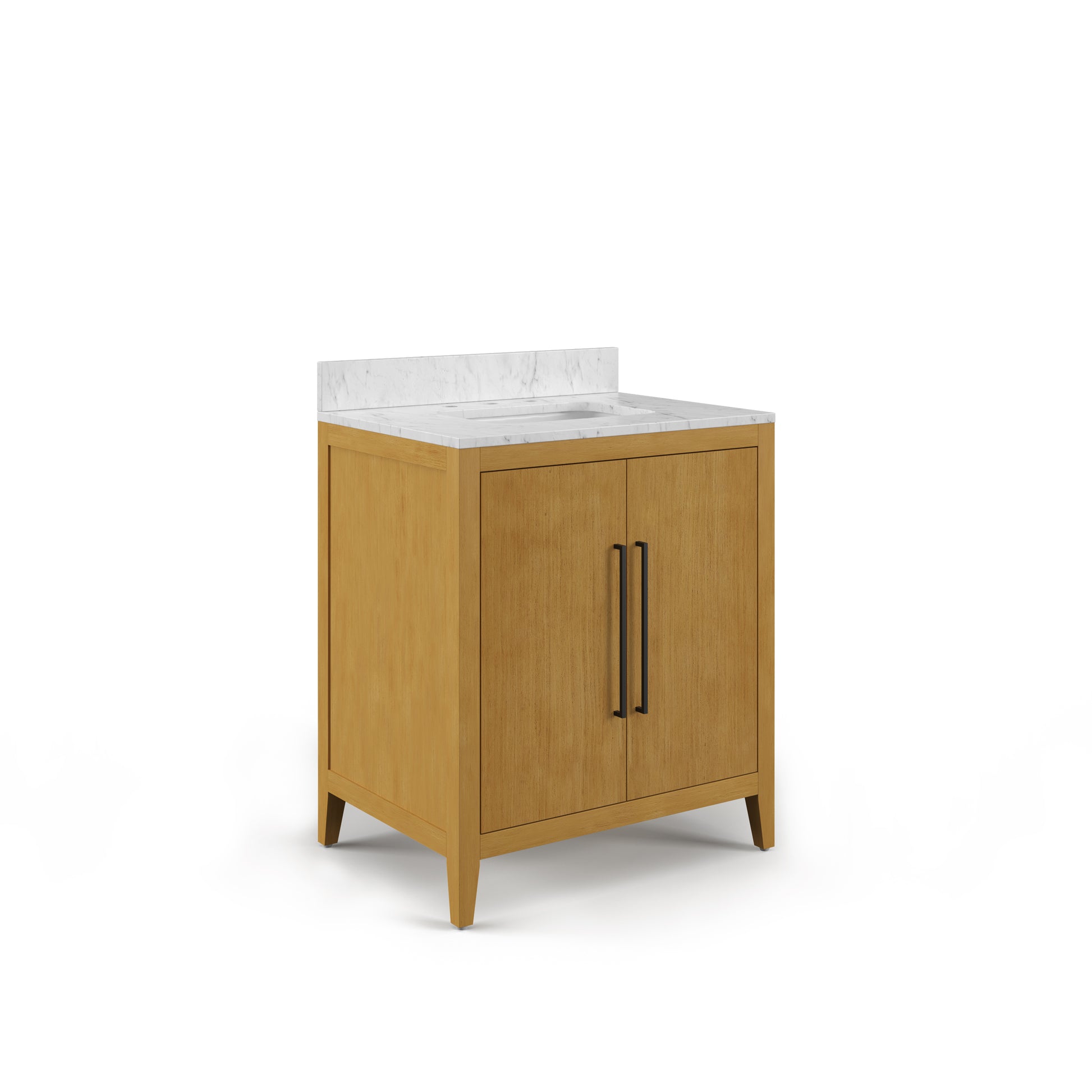 Bring Mid-Century Modern style to your bathroom with the 30" Lusso Single Sink Bathroom Vanity in Baja Oak. Made from high-quality wood, this freestanding vanity features a natural, light wood finish with Matte Black hardware and a Carrara white engineered marble top with matching 4" backsplash. A white undermount ceramic sink, pre-drilled 8" widespread faucet holes, and soft-close doors and adjustable shelves offer a balance of function and style. Fully assembled and space-conscious, it’s a perfect fit for standard bathrooms that need both style and function.