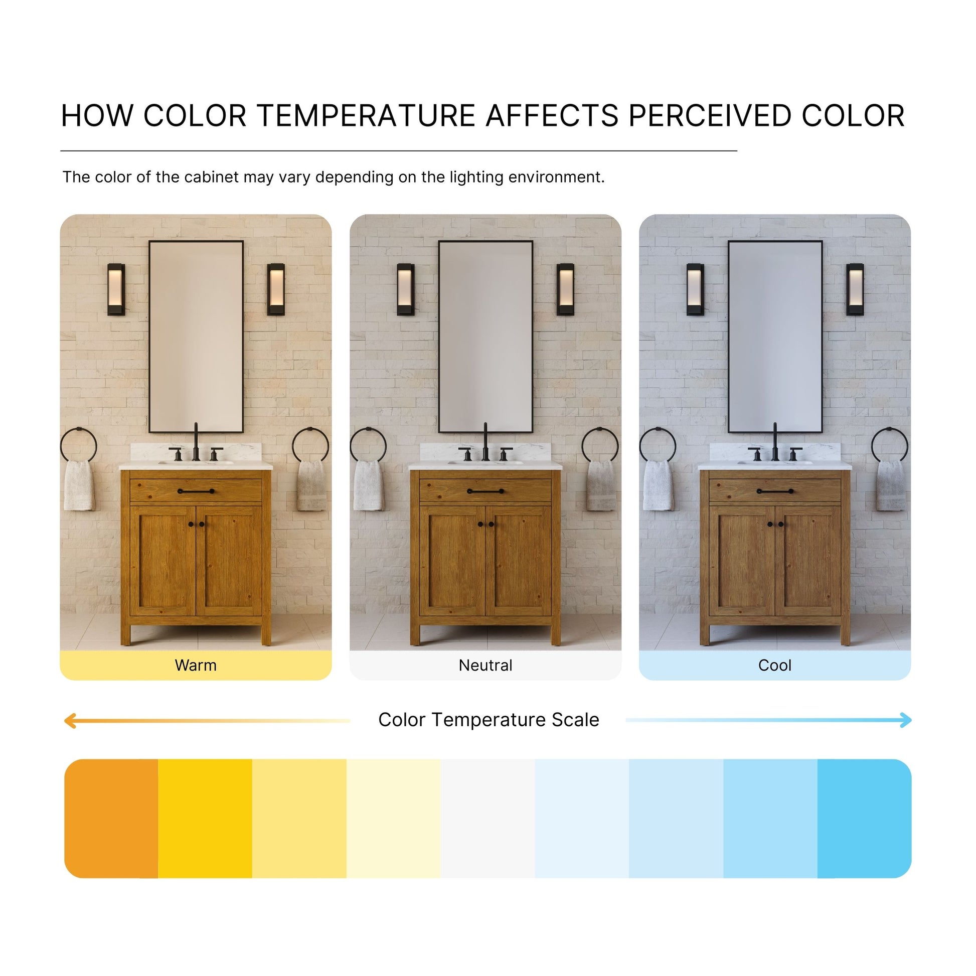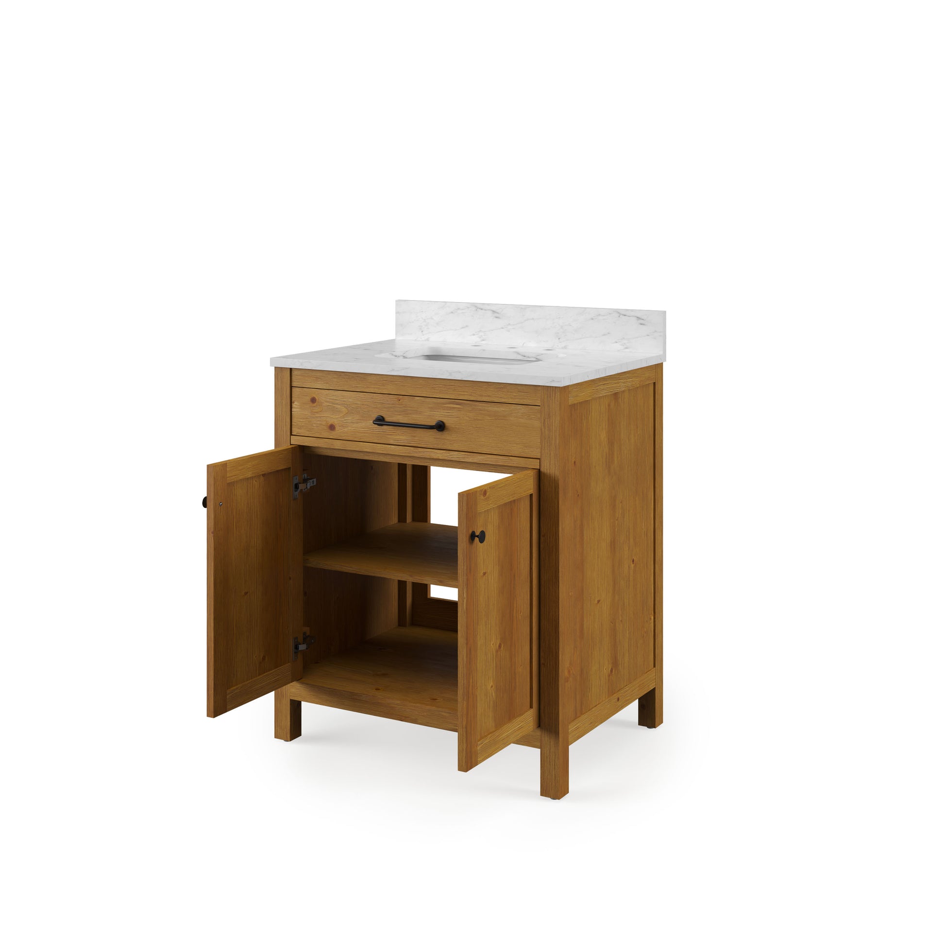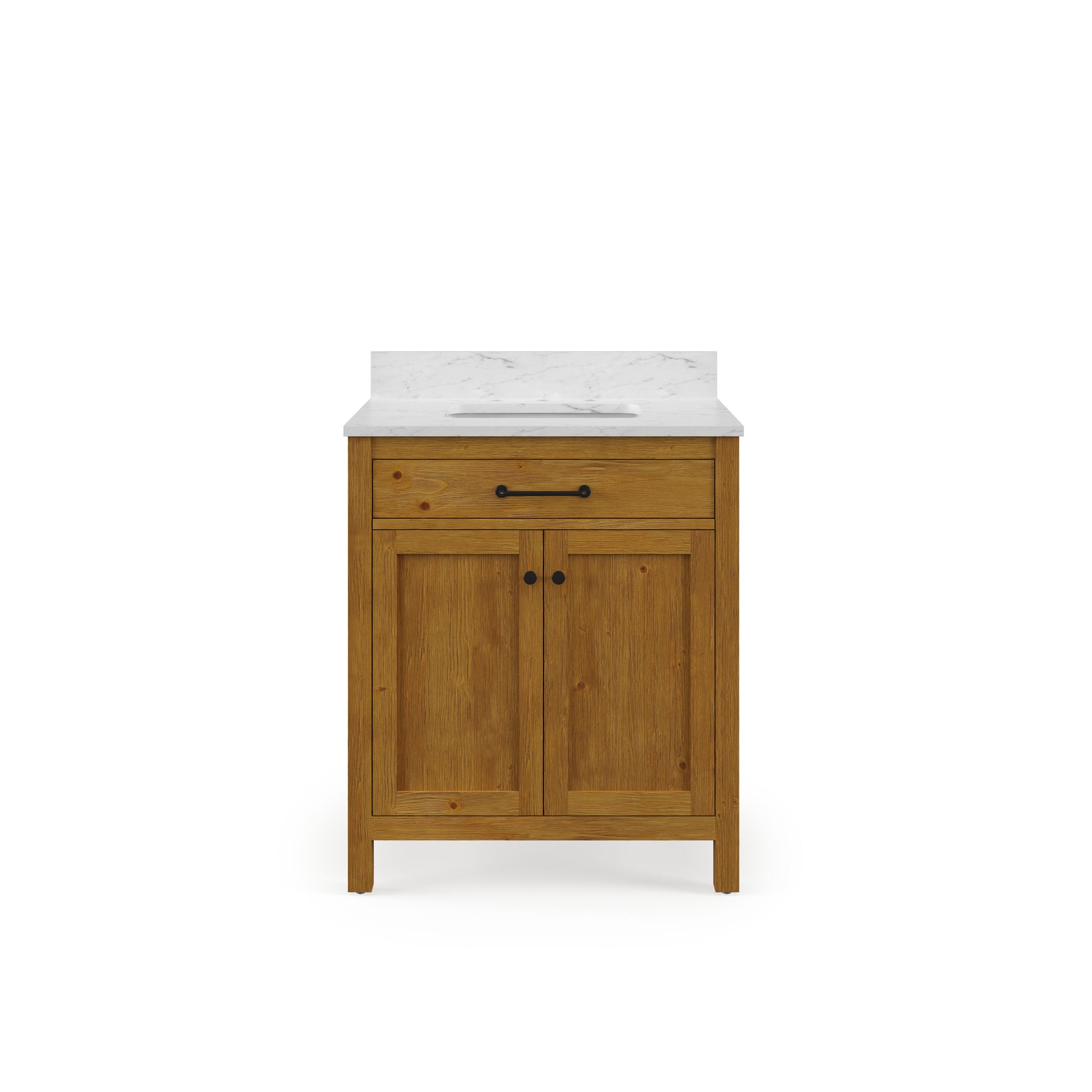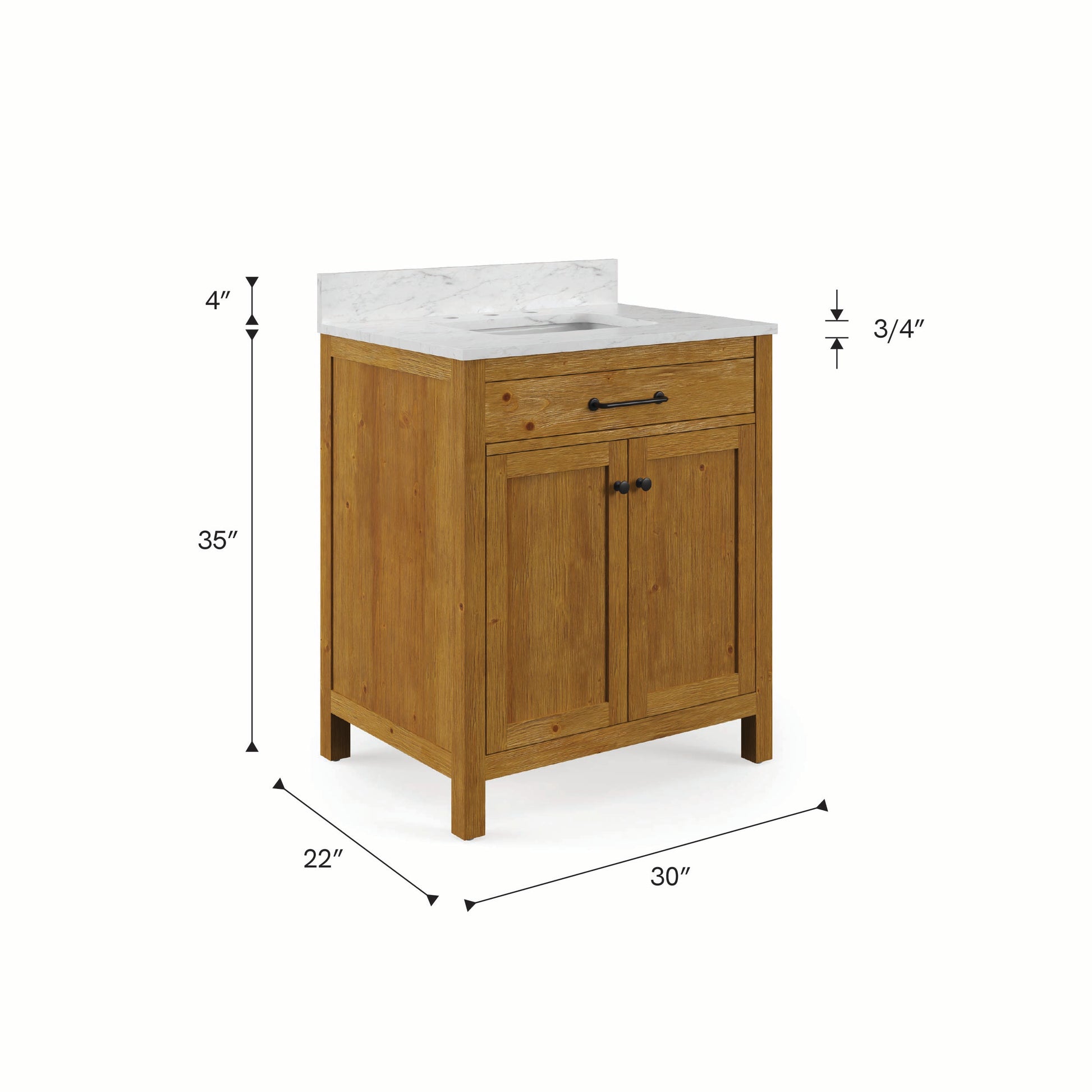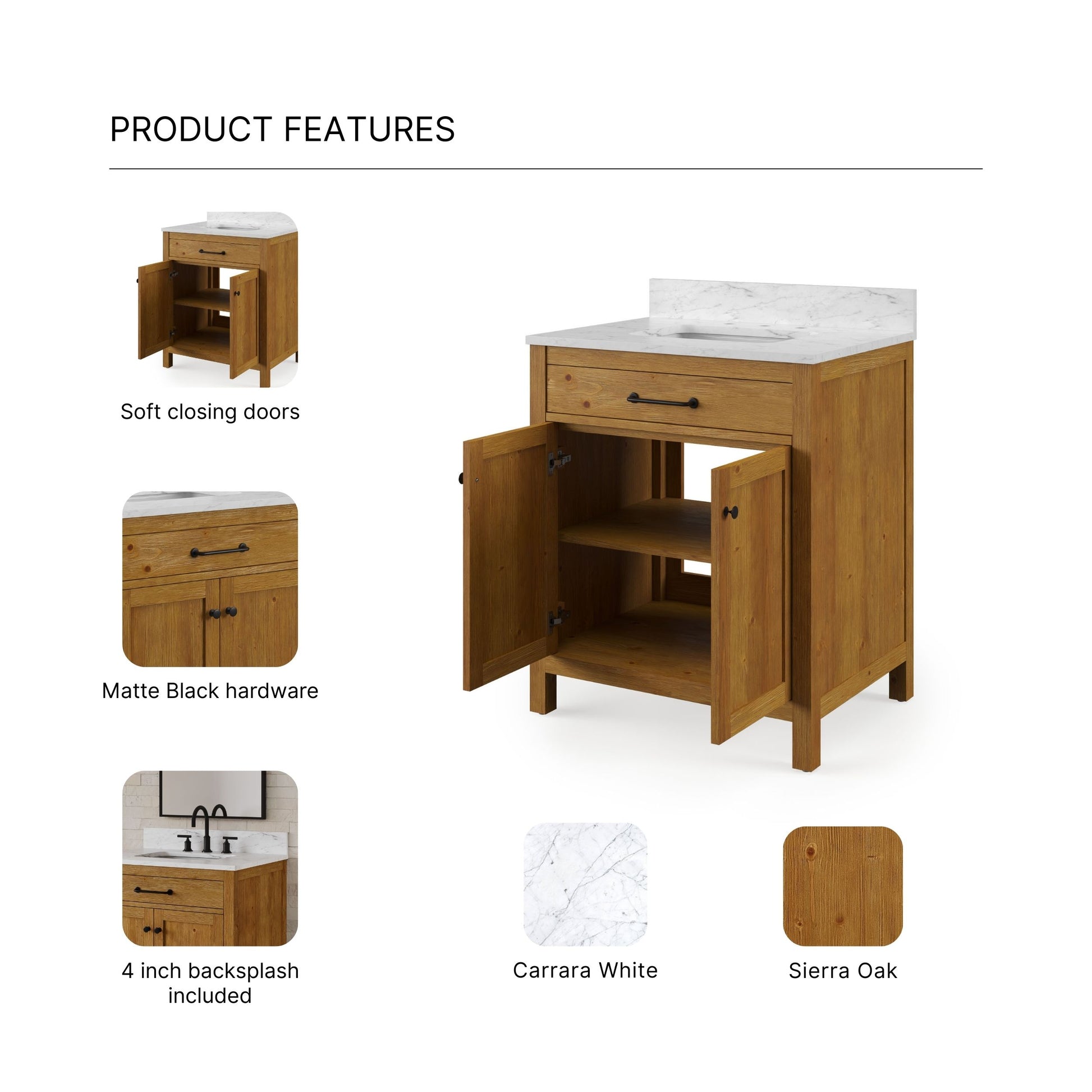 Bring natural warmth and texture to your bathroom with the 30" Pista Single Sink Bathroom Vanity in Sierra Oak. Crafted from high-quality wood, this freestanding vanity features a rustic, light wood finish with visible grain and Matte Black hardware. A Carrara white engineered marble top and matching 4" backsplash add a refined touch, while the white undermount ceramic sink and pre-drilled 8" widespread faucet holes ensure easy installation. Soft-close doors and adjustable shelving offer practical storage in a compact design—perfect for small spaces seeking Mid-Century Modern style.